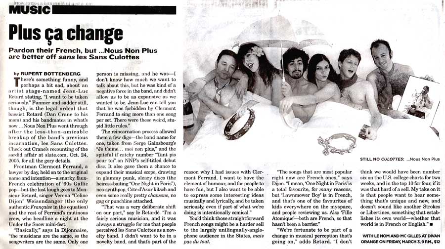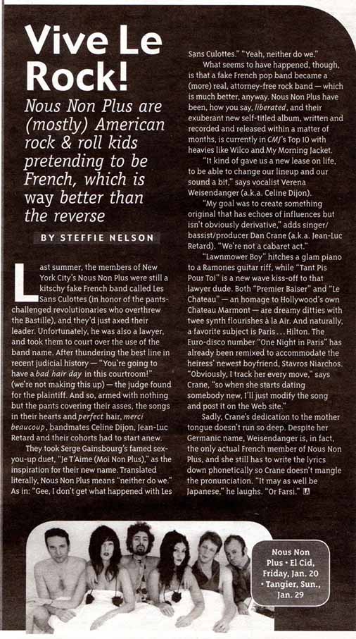 …Nous Non Plus …Nous Non Plus’ chanteuse (female vocalist) Céline Dijon (ah!) hails from Paris, but the other six members of NNP come from foreign places like Pittsburgh, Denver and San Francisco. The septet actually met at the Rhode Island School of Design in the early 1990s and transplanted to New York City in 1998. Their music is a tongue-in-cheek American interpretation of French pop, but the songs are catchy with a dancehall-friendly sound.